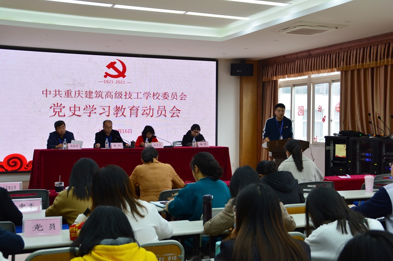 3月16日下午,重庆建筑技师学院在综合口五楼多功能教室召开党史学习教育动员大会,深入学习贯彻落实习近平总书记在党史学习教育动员大会上的重要讲话精神,按照党中央决策部署和市委、市国资委、集团党委工作要求,对学院党史学习教育进行动员部署。学院党委书记张何出席会议并做动员讲话。学院班子成员、基层党支部书记及全体党员参加了会议。