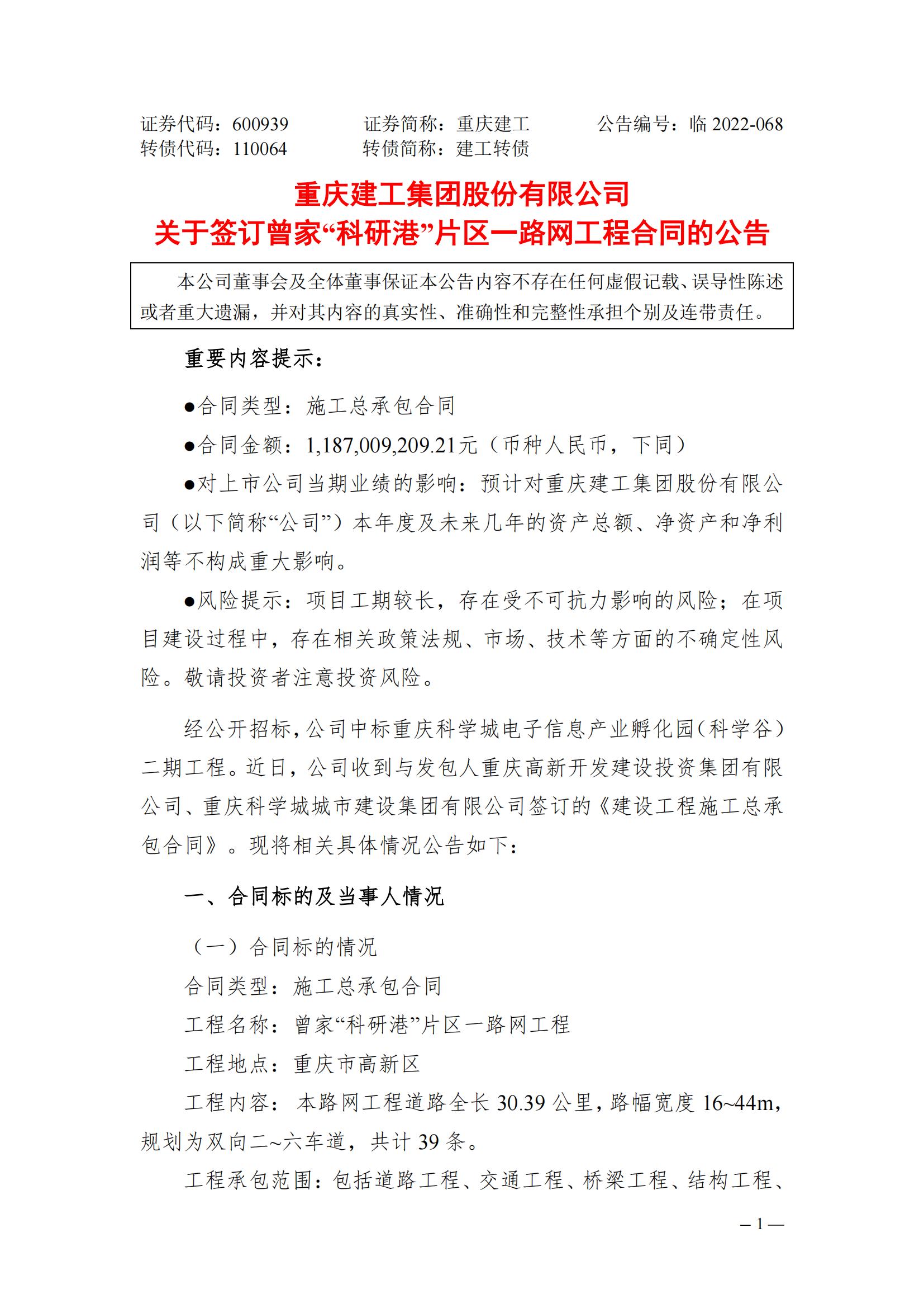 关于签订曾家“科研港”片区一路网工程合同的公告