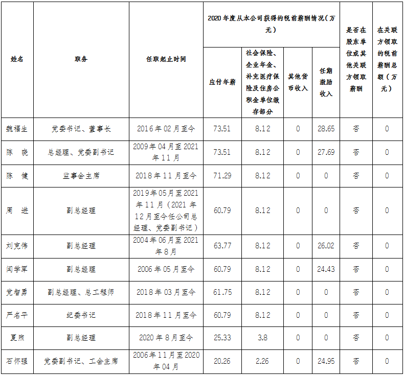 备注:1、以上披露信息为我公司企业负责人2020年度全部应发税前薪酬(不含2020年发放的以往年度薪酬)。